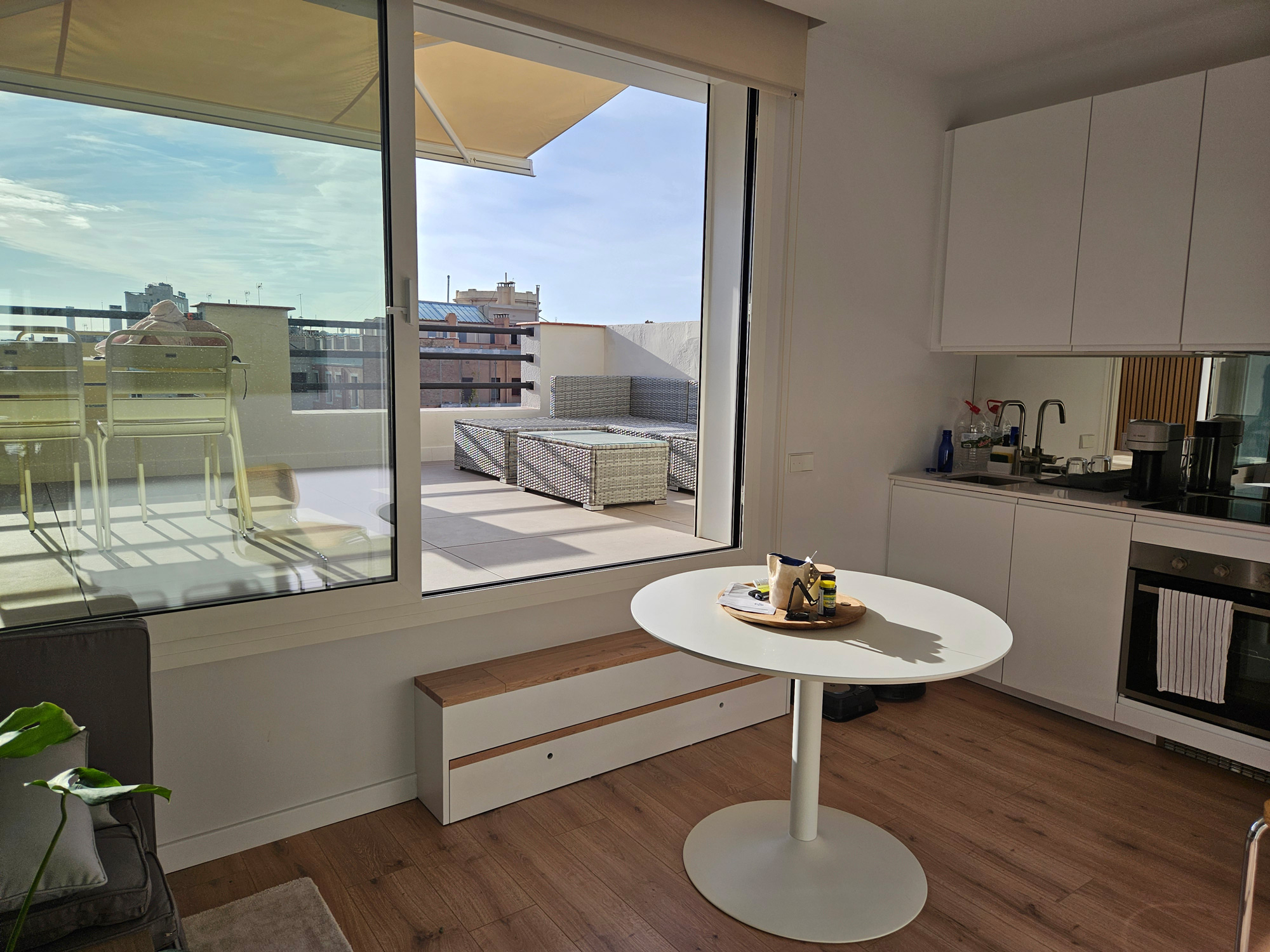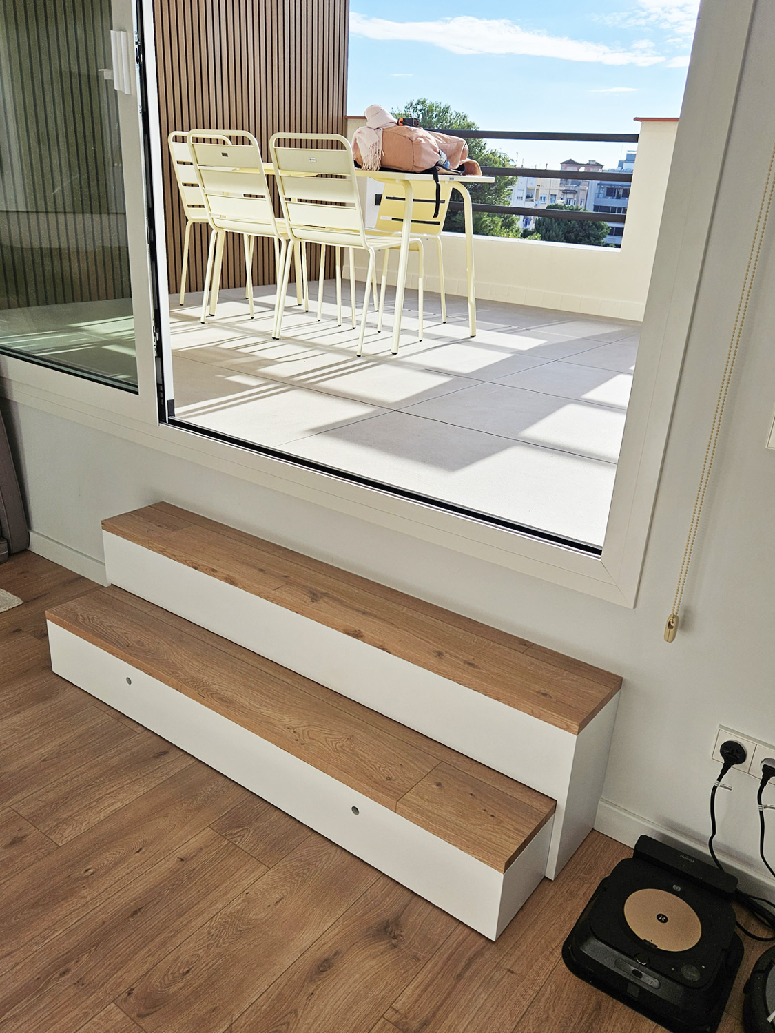 Se trata de un apartamento en una ubicación increíble de Barcelona con vistas a un jardín de preciosos árboles. La terraza se incorpora a la vivienda como prolongación de la sala por un gran ventanal. El gran desnivel entre interior y exterior nos permitió considerar unos escalones que se convierten en banco para sentarse, muy práctico para un espacio tan reducido.